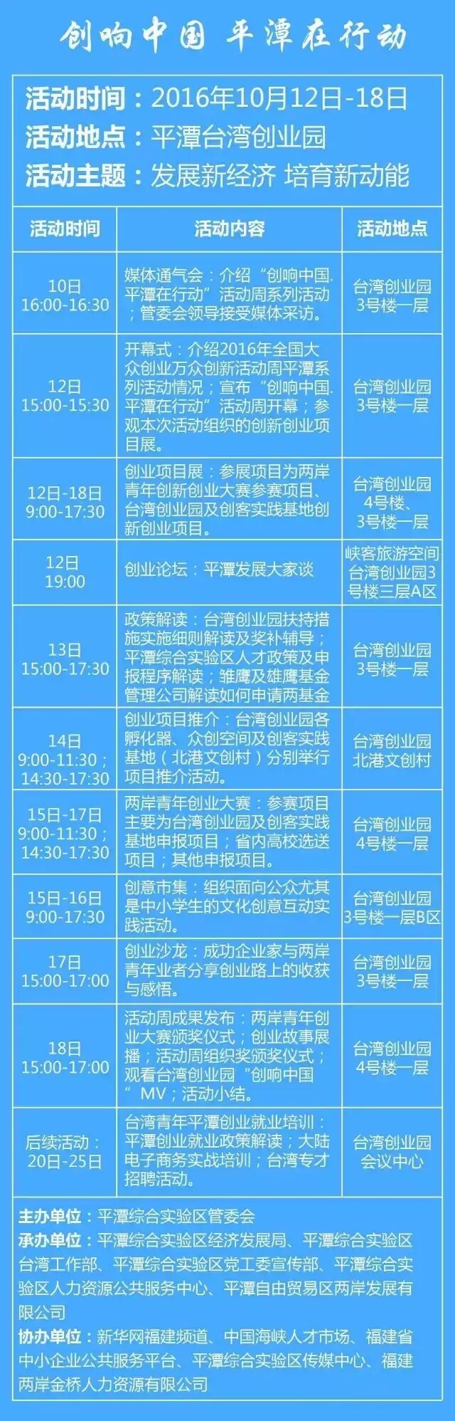 全国“双创”活动启幕,两岸主题活动创响平潭! 延续整个活动周的两岸青年创业成果展将集中展示创业大赛参赛项目、台湾创业园及创客实践基地的创新创业项目;创业论坛还将围绕台湾创业园扶持措施实施细则及奖补辅导、平潭综合实验区人才政策及申报程序等进行解读,为两岸创业青年的落地提供指导。 据了解,本次活动以平潭国际旅游岛和两岸共同家园建设为特色,旨在通过主题活动总结推广两岸青年创业创新经验,厚植创业创新文化,为平潭发展新经济、培育新动能营造良好的氛围。 “台品购”电商平台试运营 联合11家台湾商户提供免税商品 台湾青年合影留恋 作为2016年全国“双创”活动周平潭系列活动之一,“台品购”项目重点合作商户签约仪式暨平台上线试运营发布会上午在平潭台湾创业园举行。平台首期签约11家台湾商户,将为消费者提供免税台湾商品和快捷配送服务。 据了解,“台品购”是今年8月18日平潭综合实验区创业合作对接会签约的重点项目。平台采用O2O电商模式,为商户提供线上门店,同时结合多种营销活动,为消费者提供台湾商品购买服务。平台首期立足平潭台湾免税市场,联合入驻商家将台湾正品尖货备货到台湾集货仓,享受岚台直邮通路的行邮税减免优惠政策。 据悉,“台品购”是目前全国唯一一家以经营台湾商品为主、以岚台两岸直邮通路为承载的电子商务平台。截至目前,“台品购”已从数万种台湾商品中精挑200多种优质商品上架。 下面是详细的活动安排表~ |